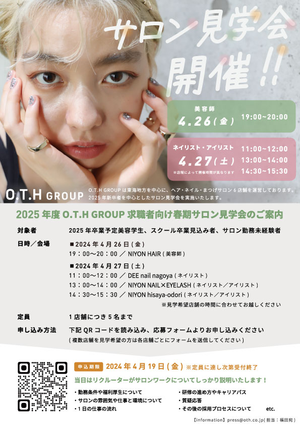 この度、O.T.H GROUP各店舗にて2025年新卒者を中心としたサロン見学会を実施することとなりました。